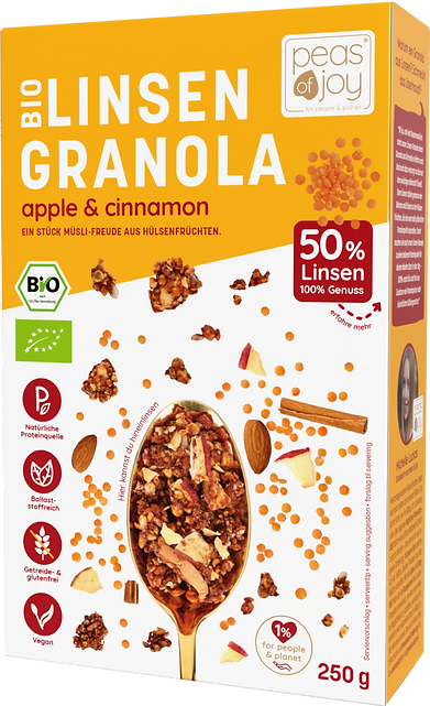 Das Granola aus Linsen, das bald auf den Markt kommt, erfreut sich in 3 auffallenden Sorten. Es ist gestalterisch aufgebaut aus dem bold-minimalistischen Schriftzug, dem Granola-Löffel als Key Visual und den einzelnd geshooteten Zutaten drum herum.
